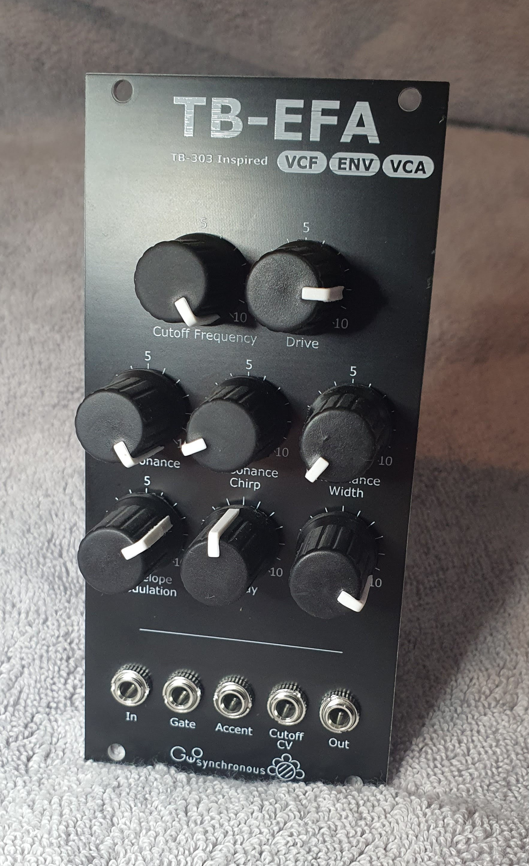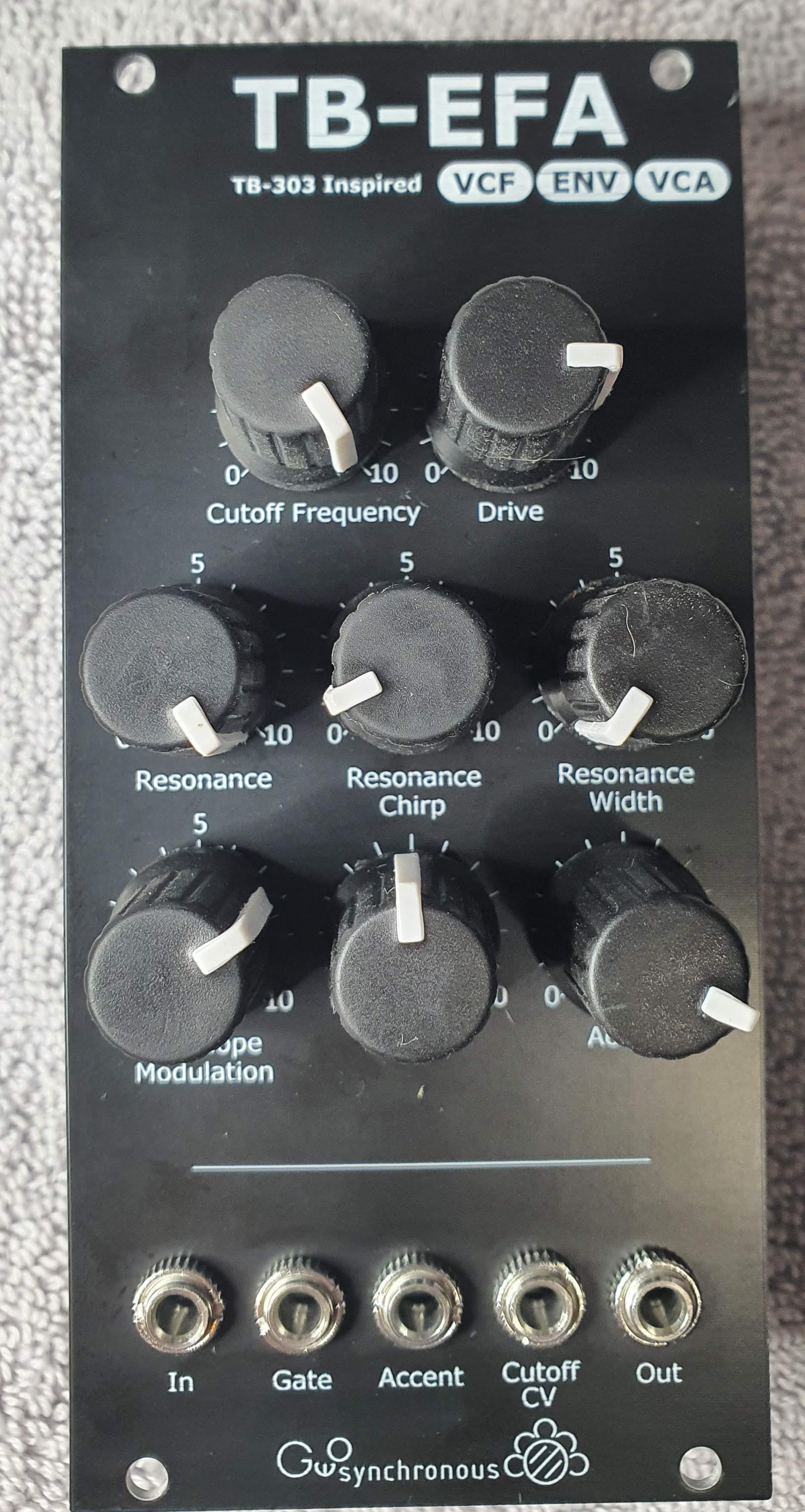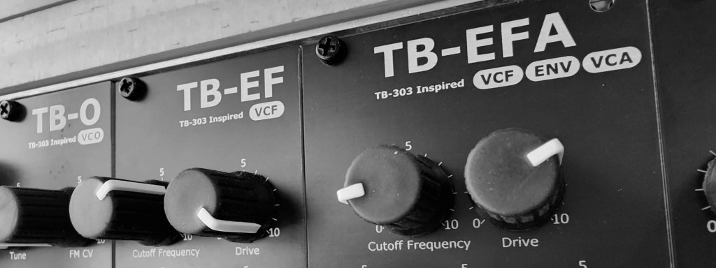 The TB-EFA shares the same ‘3 and a bit’ pole filter circuit as the Roland TB-303. It also provides a complete version of the envelope used by the 303 with decay control. Rounding off the module is the BA662 based VCA circuit which is also controlled by the same envelope as the filter.