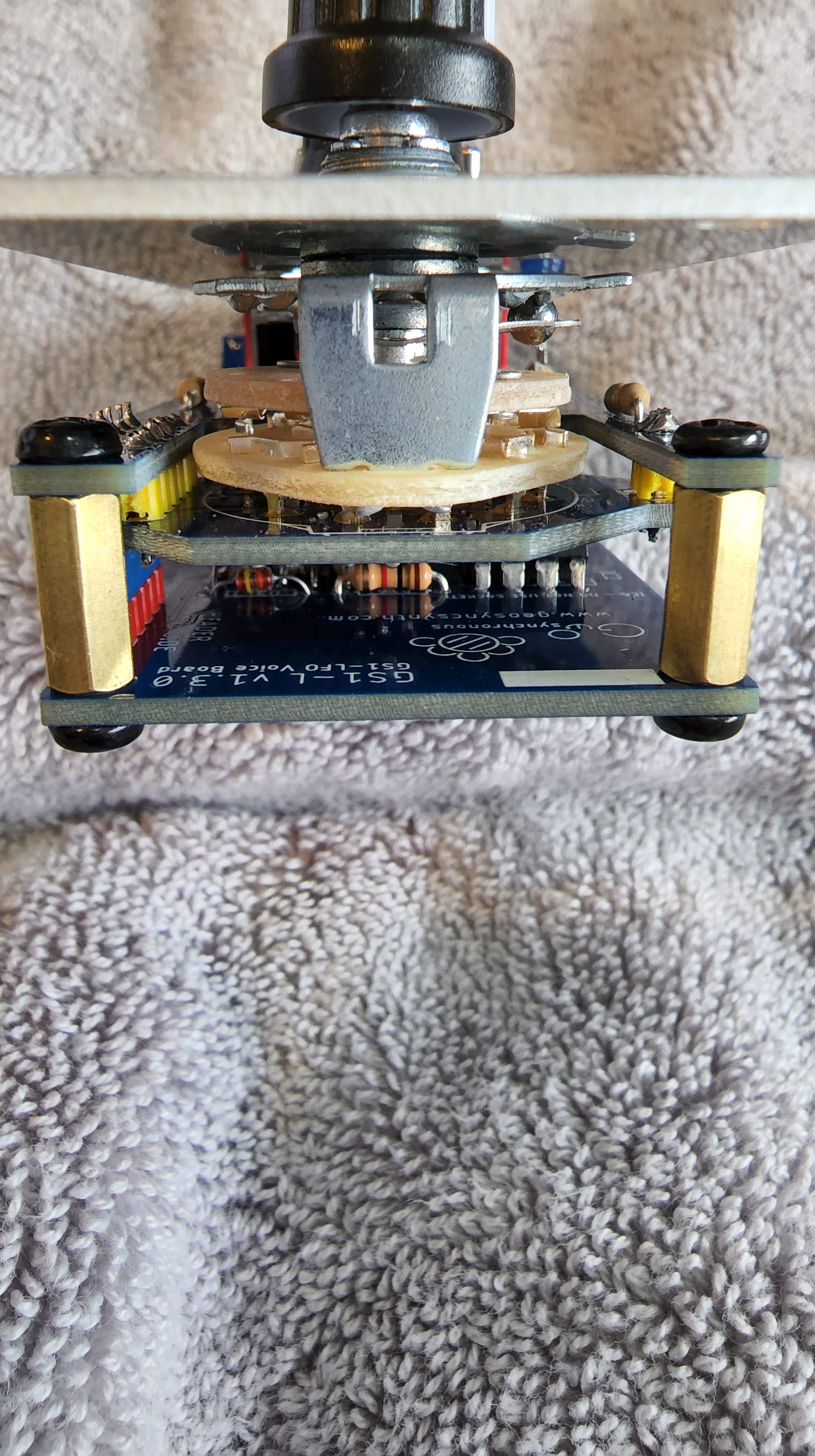 The module makes use of the 2P5T switch, despite it being deeper than the normal pots and jacks used in Eurorack modules, by means of a mezzanine card. This also means care was needed when designing the PCBs to ensure no tall components are placed under the switch. There is on 8-pin DIP IC towards the top of the lower board, be sure not to use a socket for the IC here!