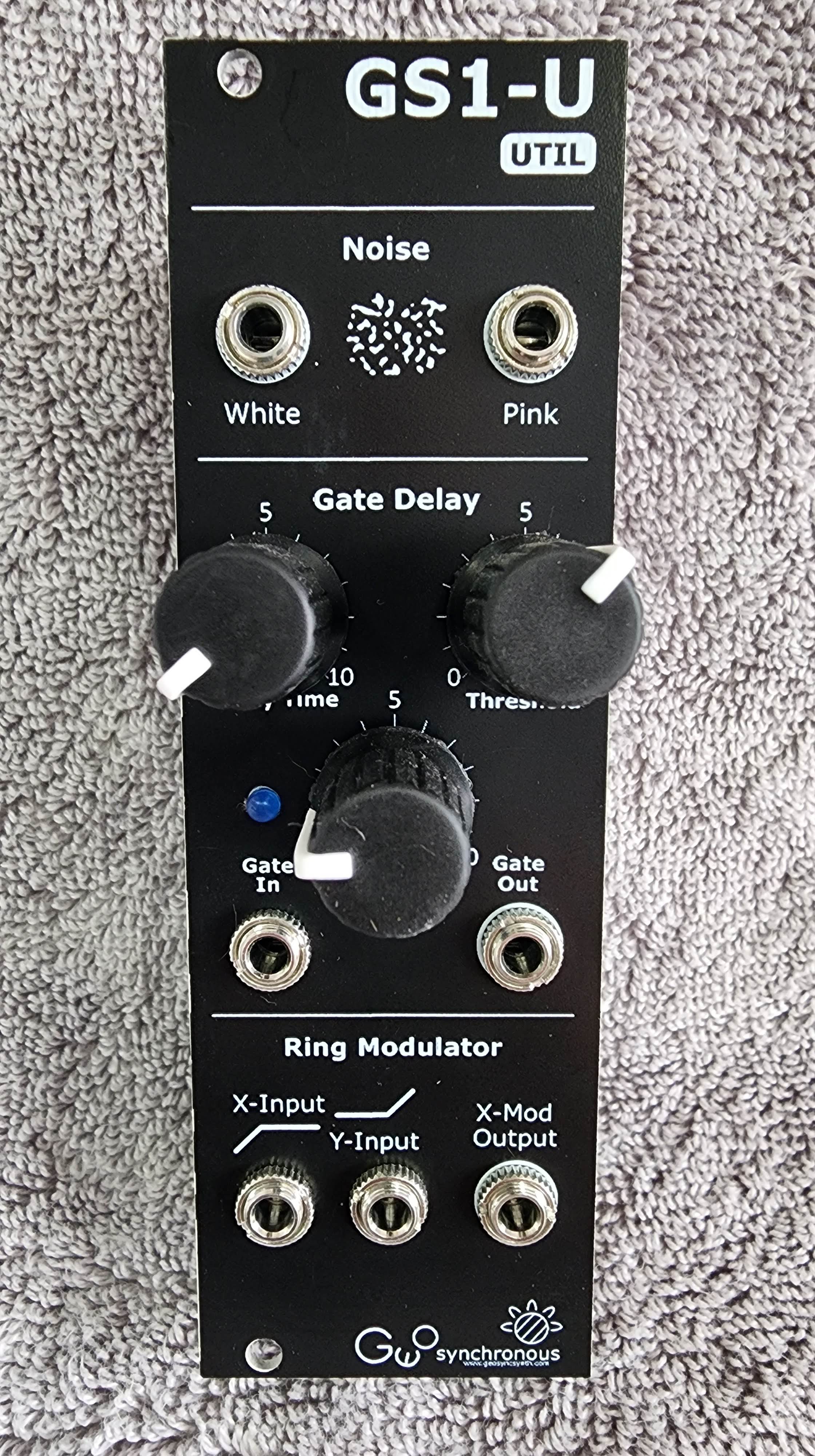The GS1-U builds on the GS1-NR utility module and provides three functions. The first is a ring/cross modulator function using the same LM1496 balanced modulator/demodulator IC as found in the Roland System 100M circuits. The second provides a transistor noise generator which can output both white and pink noise. The third is a gate delay circuit with configurable settings.