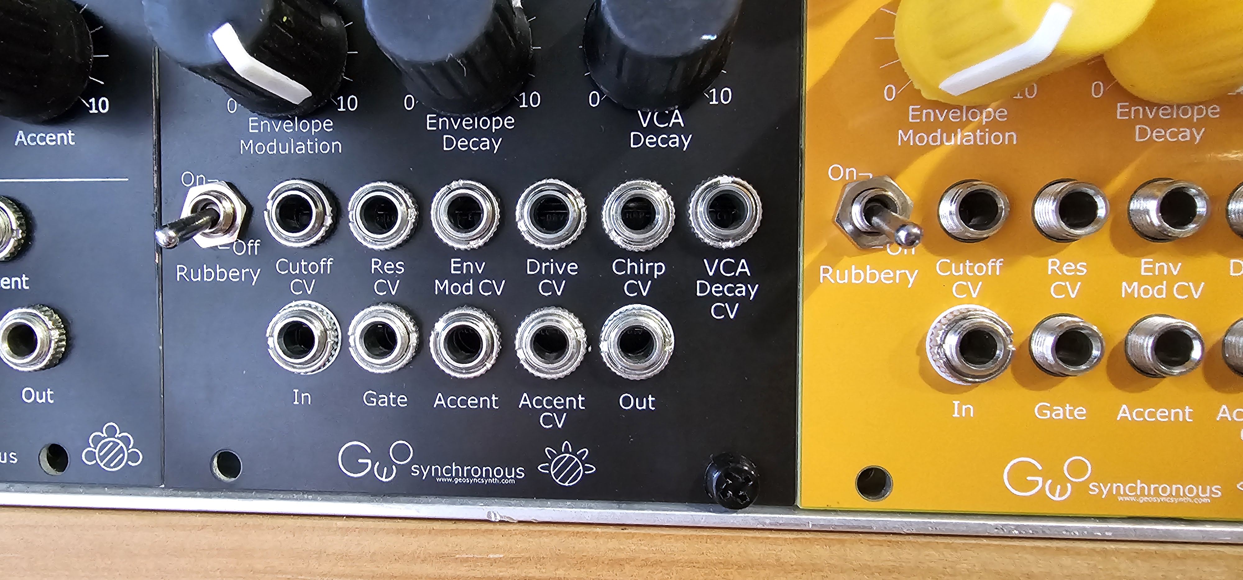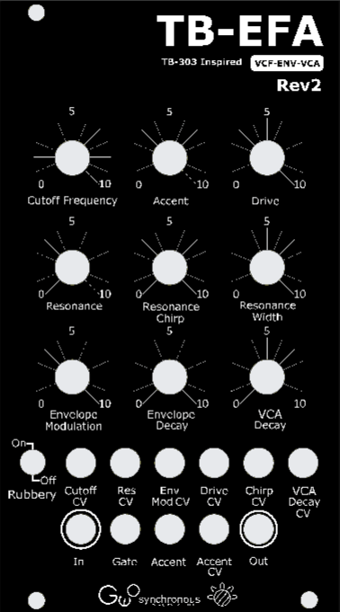 - CV Inputs: Gate, Accent, Cutoff, & REV2 Added Resonance, Envelope Mod, Env Decay, Drive, Chirp, VCA Decay